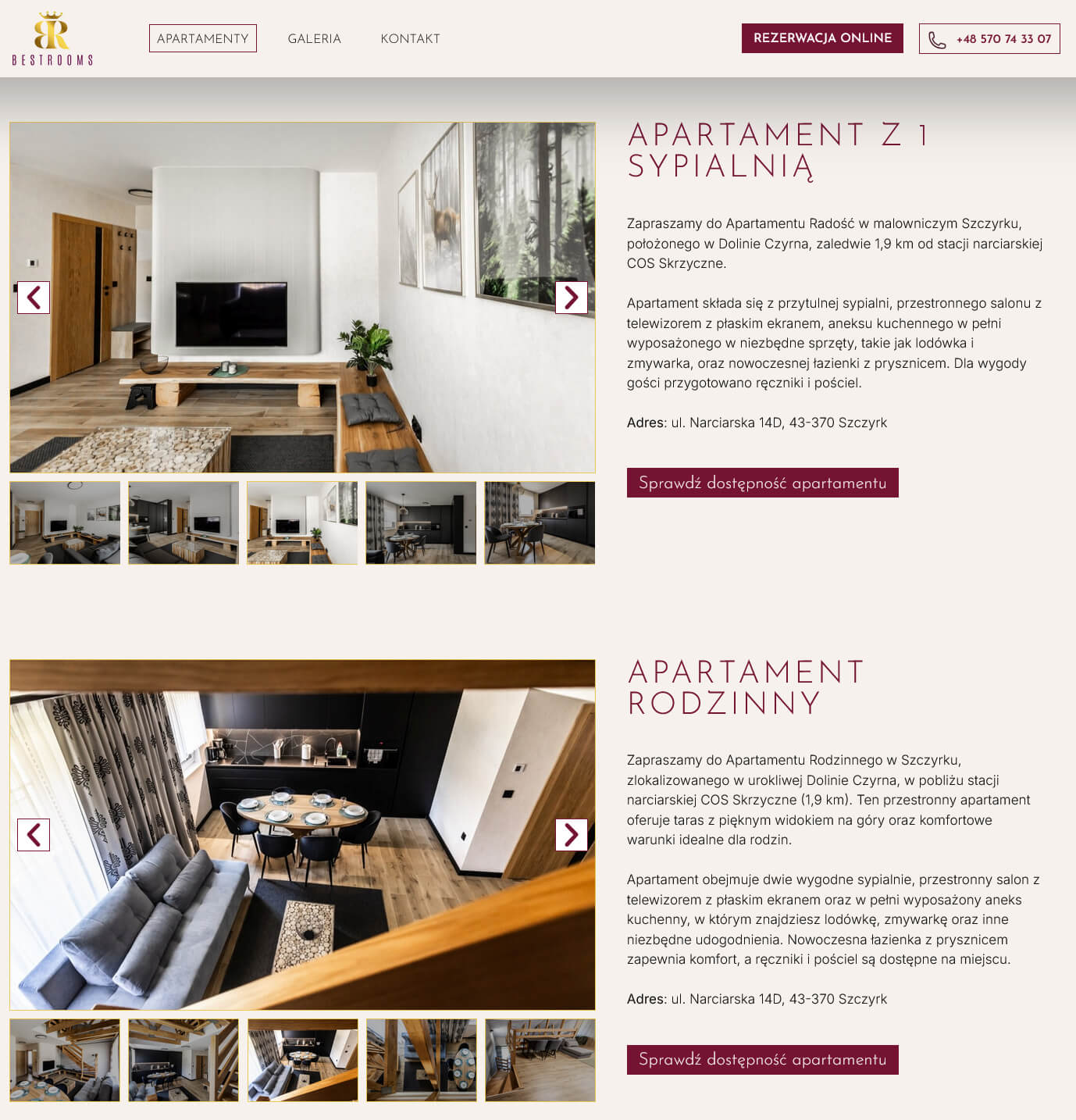 Realizacja strony dla BestRooms Apartamenty to przykład projektu łączącego estetykę premium z zaawansowaną funkcjonalnością rezerwacyjną. Od projektu wizualnego, przez wdrożenie, aż po integrację z systemem Hotres. Każdy etap został wykonany z myślą o komforcie gościa i maksymalizacji efektywności działania obiektu.